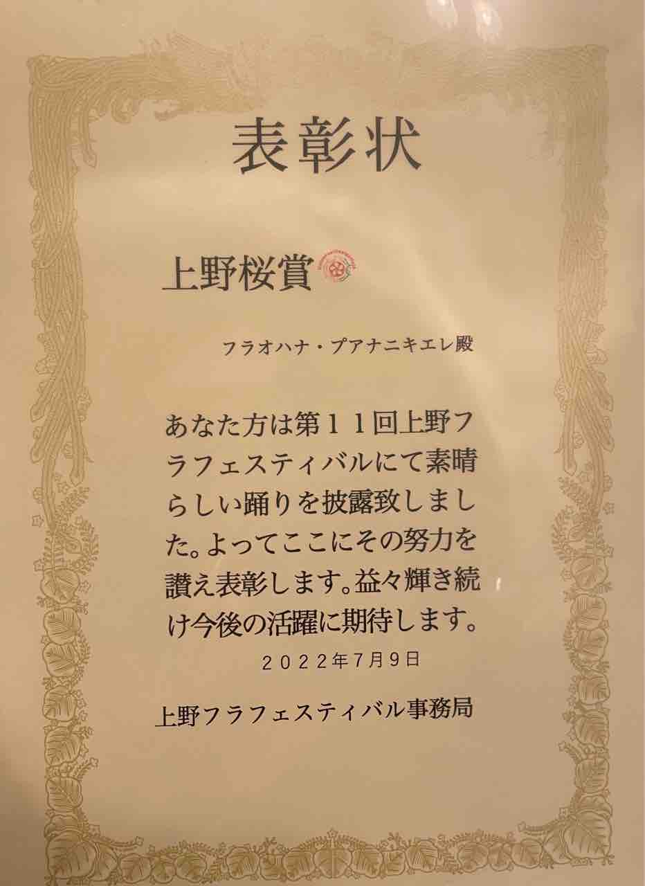 上野フラフェスティバル 2022.07.10 出張イベント 見てくださっていたみなさんから、いただいた写真の一部です。 マイスイートピカケレイ(ロケラニクラス) フラベイビー(ピカケクラス) たくさんのお写真、ありがとうございました❤️ その後は、白い衣装に着替えて、イリマクラスのみんなも入って、合同でプアサクラ この曲は「さくらエキシビジョン」というカテゴリーにエントリーしたから?踊り終わった後に、表彰状をいただきました。 全然知らなかったので、びっくり💦 いつも思うけど、このステージは本当に、踊っていて気持ちがいいの💕 Tweet Share 出張イベント 上野フラフェスティバルの合同レッスン前の記事 レッスン次の記事